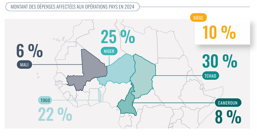 En 2024, le volume d’activité de SEVES (1,92 k€) est resté relativement stable avec une augmentation de 9% par rapport à 2023. 92% du budget de SEVES est utilisé pour les projets dans les pays d’intervention. L’activité a connu un équilibrage important entre les pays : le Niger est le premier pays d’activité, suivi du Tchad, du Cameroun et du Togo. Les achats et charges externes (travaux, prestations) directs de SEVES représentent 41% du volume d’activité. Les dépenses réalisées via des fonds rétrocédés aux ONG partenaires locales (35%) ont connu une augmentation importante attestant de la stratégie de renforcement des partenaires. Enfin, la masse salariale de SEVES représente 24% de l’activité.