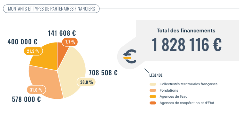Les financements obtenus sont essentiellement composés de subventions (99%). Ils proviennent de collectivités territoriales françaises, de fondations, d’agences de l’eau et d’agences françaises de coopération. Ils ont connu une diminution de 30% par rapport à 2023, en particulier du fait des coupes budgétaires dans l’aide publique au développement française et du non-renouvellement et/ou de l’arrêt de projets au Niger.